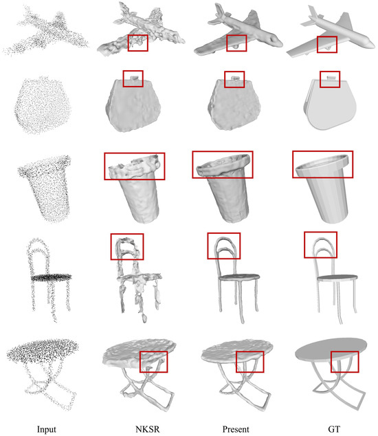 To verify the effectiveness of the proposed method in a noisy environment, a comparative experiment on the 3D surface-generation method NKSR [42], based on deep learning, is presented in Figure 11. NKSR is a new method for reconstructing 3D implicit surfaces from large-scale, sparse, and noisy point clouds using a linear combination of learned kernel basis functions to evaluate the value of the function at the corners of the voxels and then extracting the 3D surface using double-marching cubes. In the face of a noisy environment, compared with NKSR, which uses hierarchical sparse data structures to achieve feature mapping, the cyclic iterative optimization method based on GRU in the paper is more advantageous. In Figure 11, it can be observed that the surface generation results of the two are not much different in the plane region (e.g., the “package” in the second row), but in the face of shapes with fine structures (such as the “chair” in the fourth row), this paper can better model the shape surface, which effectively alleviates the influence of noise on the 3D surface generation.