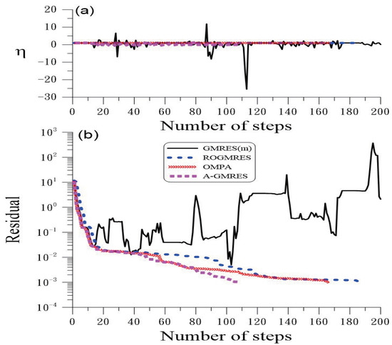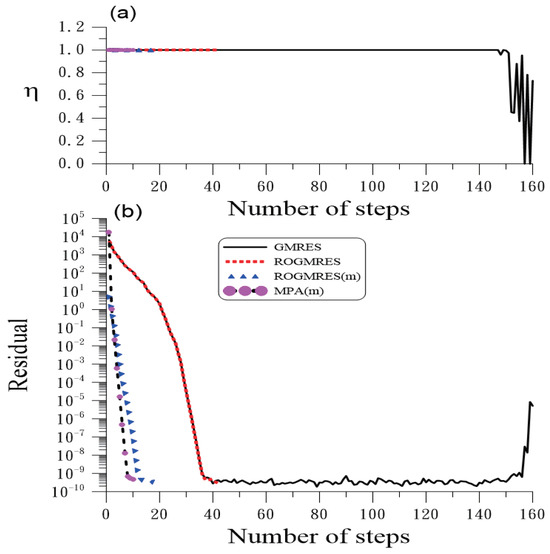 It is interesting that the MPA(m), with a fixed value , can attain a highly accurate solution with ten steps, as shown in Figure 1b; A-GMRES(m) obtains ME = with 15 steps by using . If the orthogonality is not adopted in A-GMRES(m), ME = is obtained with 14 steps; it means that can be kept, even though the orthogonalization technique was not employed. Within ten steps, A-GMRES with can obtain ME = . Within nine steps, A-GMRES(m) with and can obtain ME = .