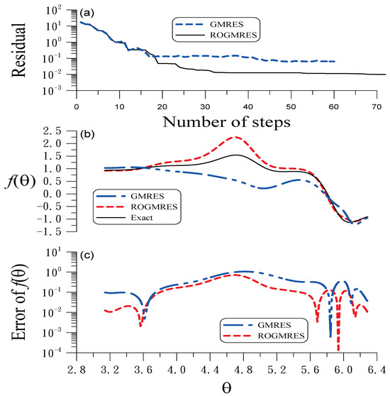 By GMRES with , through 60 iterations the residual is shown in Figure 2a, which does not satisfy the convergence criterion with . If we run it to 70 steps, GMRES will blow up. In contrast, ROGMRES converges with 72 steps. As compared in Figure 2b, ME obtained by ROGMRES is smaller than 0.27, as shown in Figure 2c. However, GMRES obtains ME = 0.5 with a worse result.