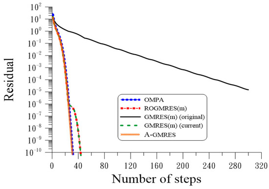 Table 3 compares the number of steps (NS) for different methods under . is used in OMPA and A-GMRES; are used in original GMRES(m), ROGMRES(m) and current GMRES(m). The NS of ROGMRES(m), and current GMRES(m) are the same, because of for the current GMRES(m) before convergence. Figure 4 compares the residuals.