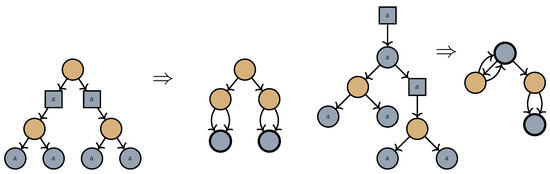 Let . A transition rule r of the form is applicable to t, if t can be written as , such that for some . If so, then there is a computation step . A computation of A on a tree is a sequence of computation steps , for some . The computation is accepting if . A tree is accepted, or recognised, by A if there is an accepting computation of A on t. The language accepted by A, denoted by , is the set of all trees in that A accepts.
