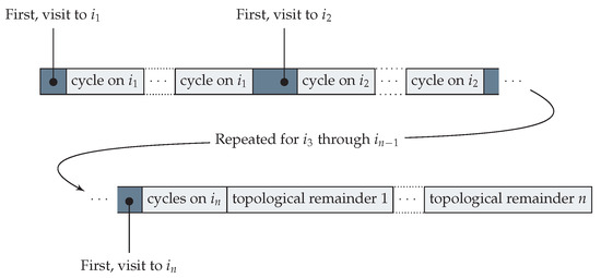 The derivation of an operation sequence from a destructured sequence . The shaded parts indicate the initial sequence P. Let . After the first visit to a position i in P, all cycles on i are inserted, which can be made using operations in S, iterating this for all positions until the remainder of S is free of cycles. Then, the non-cyclic suffix of S is placed at the end of this sequence in a way determined by a topological sort of operation, iteratively appending all operations that require a visit not made in the remainder of S.