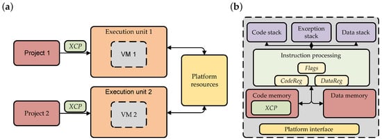 Usually, programmers who work with IEC 61131-3 focus on software projects intended for deployment on various controllers. In this context, it is assumed that such a project is executed by a runtime component referred to as an execution unit. A project consists of one or more tasks composed of Program Organization Units (POUs), such as program or function blocks. Consequently, a smaller device typically provides a single execution unit capable of running one project, while a controller with more powerful hardware can accommodate multiple execution units, allowing many projects to run simultaneously as shown in Figure 1a. In this context, an execution unit maintains an instance of the virtual machine, which establishes an isolated environment for executing control programs stored as binary intermediate code, shown as eXecutable Control Program (XCP). In such a solution, a control project is compiled into the binary format and subsequently transferred to the execution unit, where it is executed through the virtual machine. The execution units also interface with platform resources for the virtual machine. An example of leveraging dual-core CPUs for creating a controller with two execution units is outlined in [20].