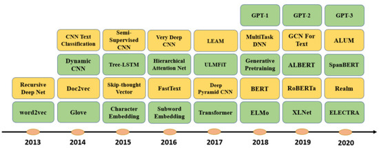 Timeline for most common deep learning-based models for text embedding and classification models [11].