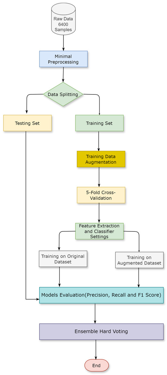 We used the same models on the original and augmented datasets to ensure consistency and fair comparison. This approach allowed us to analyze the impact of data augmentation on the performance of the models. The ensemble of the top three models was applied to both datasets, and the results were reported for each. Overall, the ensemble with hard voting on the augmented dataset showed a higher improvement in performance.