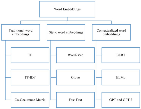 Machine learning models cannot deal with raw textual inputs. Text representation is a mandatory step to generate numeric vectors to be processed by the classification models. Word embeddings are numeric representations (vectors) in n-dimensional space that capture the word meanings. It is a technique used to map words in the text to vectors in the space. The evolution of word embedding techniques has facilitated text classification tasks. In the literature, three dominant word embeddings exist, namely traditional word embeddings, static word embeddings, and contextualized word embeddings [51]. Figure 3 shows the main three categories of word embedding methods.