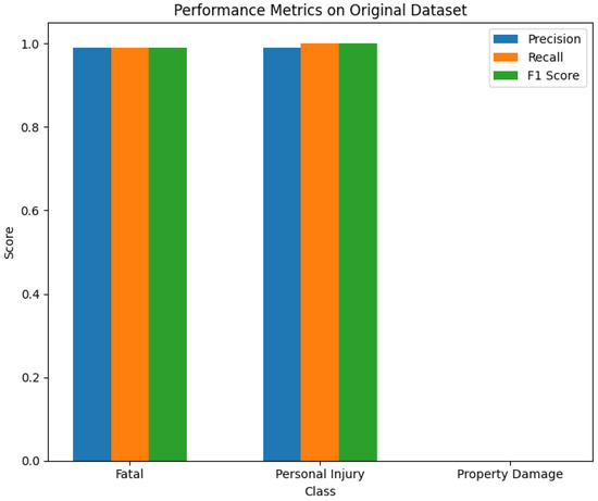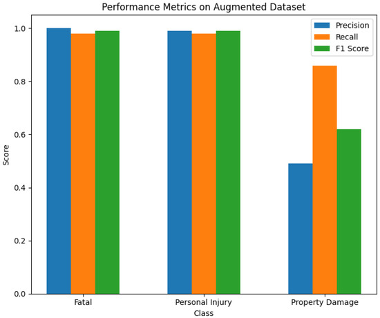 The ensemble model demonstrated significant improvements in precision, recall, and F1 score compared to individual models, as shown in Figure 12 and Figure 13. These figures highlight the performance metrics of the ensemble model on both the original and augmented datasets, clearly indicating the advantages of data augmentation and the hard voting approach for crash severity classification.