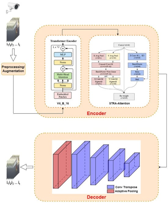 This section gives a thorough investigation about our experimental evaluation of the model using a variety of large-scale anomaly detection datasets. Different experiments based on the encoder–decoder architecture were launched, where the pre-trained ViT model is considered an encoder with the decoder constituting the “baseline” architecture. Then, the STR attention block was involved after the ViT to show the usefulness of using the spatiotemporal characteristics for video anomaly detection.