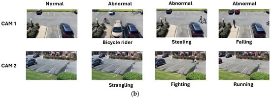 32] is a multi-camera anomaly dataset set in a commercial parking lot, which includes 420 videos with over 1.15 million high-resolution frames from four camera views. Scenes 1–3 and Scene 4 are captured at 30 frames per second, and at 1920 × 1080 resolution and 1280 × 720 resolution, respectively. According to its authors, it is the largest fully annotated anomaly detection dataset, offering detailed person annotations from continuous video streams captured by stationary cameras. The CHAD provides human detection, tracking, and pose annotations encompassing four types: frame-level anomaly labels, person bounding boxes, person ID labels, and human key points. It includes 59,172 anomalous frames representing 22 distinct behaviors categorized into group and individual activities, and 1,093,477 normal frames. The group activities comprise fighting, punching, pushing, pulling, slapping, strangling, theft, etc., while the individual activities include throwing, running, riding, falling, littering, etc.