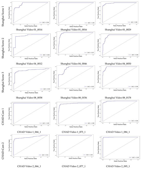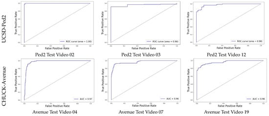 Figure 6. The figure shows the ROC results for different test videos from the four datasets, which demonstrate the effectiveness of using the ViT transformer coupled with the spatiotemporal attention model to enhance the detection accuracy of normal/abnormal frames for surveillance videos.