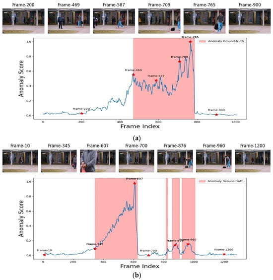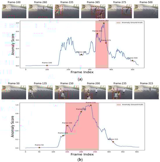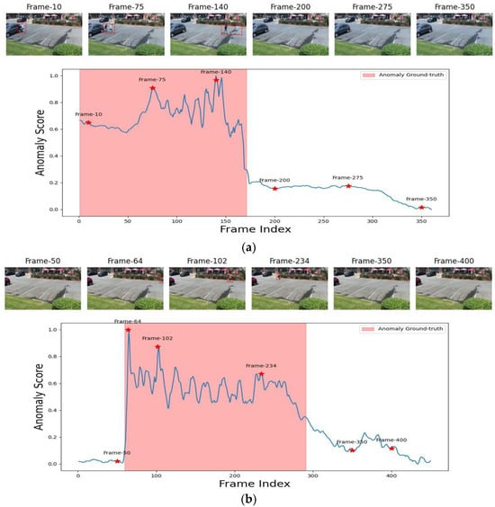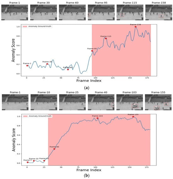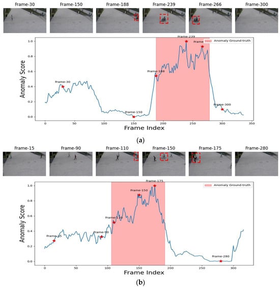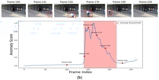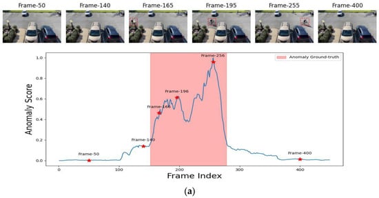 Figure 11b depicts a cyclist with an umbrella and shows that the anomaly score was extremely high when this anomalous event occurred. As a result, the above figures show that the model performed exceptionally well in detecting distinct anomalous events and objects in the three different datasets. It demonstrated its efficacy in differentiating between normal and abnormal events in videos by producing high anomaly scores for anomalous intervals and low scores for normal ones.