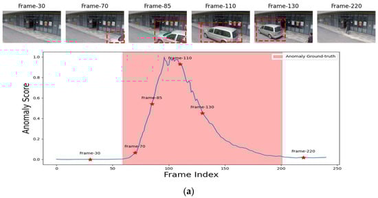 Figure 11, which exhibits the anomaly scores with shaded ground truth for videos 0144 and 0147 from the Shanghai scene 06, the model optimally recognized the unusually moving car on the sidewalk with extremely high scores, as shown in