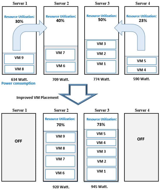 Figure 1 gives an example of improved VM placement aiming at reducing the power consumption and resource wastage. In this figure, 9 VMs are placed on 4 different PMs utilizing resources to some extent. It can be seen that the PMs’ resources are not utilized properly. One way to improve resource utilization is by migrating VMs from server 1 to server 2 and from server 4 to server 3 so that server 2 and server 3 become more utilized and well balanced in term of resource usages, while servers 1 and 4 are switched off to save energy. All servers in the figure are assumed to be Lenovo ThinkSystem SD535 V3, where power consumption at different utilization levels is stated in Table 2.