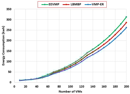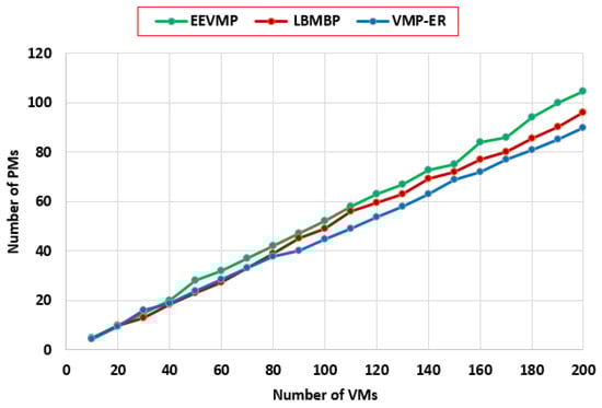 Figure 2 indicates the number of PMs required to host varying numbers of VMs. VMP-ER outperforms EEVMP and LBMBP in terms of the total number of active PMs due to its packing efficiency aiming at allocating more VMs to a single PM while taking load balancing into account. In contrast, EEVMP and LBMBP tend to place most VMs on SR850 servers first, as their decisions are based mostly on power efficiency. As the number of VM requests increases, both algorithms start to activate more PMs to accommodate these requests, as previously discussed in this section.