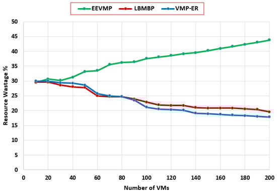 Figure 4 shows the percentage of average resource wastage (CPU and RAM) when hosting different numbers of VMs. A reduction in the number of active hosts indicates an improvement in the average utilization of resources. For a small number of VMs, LBMBP performs better than both EEVMP and VMP-ER. Comparing the performance of our algorithm to LBMBP, both algorithms utilize resources effectively with minimal resource waste. However, as the number of VMs increases, our algorithm starts to yield better results. This is because VMP-ER maintains higher resource utilization by incorporating the resource usage factor at the host level, leading to more efficient host selection and overall energy saving in the data center.