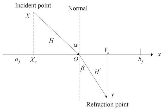 where and are the x-axis components of the refraction point and the incident point, respectively.