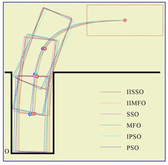 It can be seen from Figure 5, Figure 6, Figure 9 and Figure 10 that compared with the other optimization algorithms, the IISSO found a more ideal reference trajectory with a shorter path length, a lower expected parking inclination angle, and a lower parking position error. It can be seen from Figure 7 and Figure 8 that compared with the other optimization algorithms, on the basis of the same tracking control algorithm (fuzzy PID), the IISSO obtained more ideal tracking control results, with a shorter path length of the actual trajectory, a lower actual parking inclination angle, and a lower actual parking position error. From Figure 11 and Figure 12, we see that compared with the other optimization algorithms, on the basis of the same tracking control algorithm (fuzzy PID), the IISSO obtained a more ideal tracking control path, closer to the near side line of the garage, with a lower actual parking inclination angle. It can also be seen from Table 2 and Table 4 that compared with the other optimization algorithms, the IISSO found a more ideal reference trajectory, the path length of the reference trajectory was shorter, the berth tilt angle and expected parking position error were smaller, and the realization time of the IISSO’s optimization was also shorter. Table 4 shows that compared with the other optimization algorithms, on the basis of the same tracking control algorithm (fuzzy PID), the IISSO obtained a more ideal tracking control trajectory, the actual path length of the tracking control trajectory was shorter, and its actual parking inclination angle and actual parking position error were also smaller.