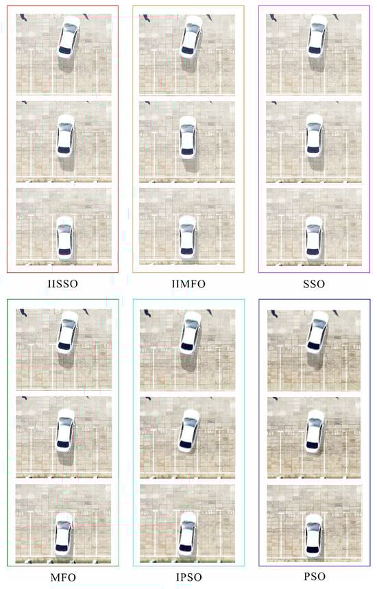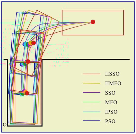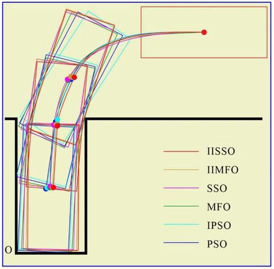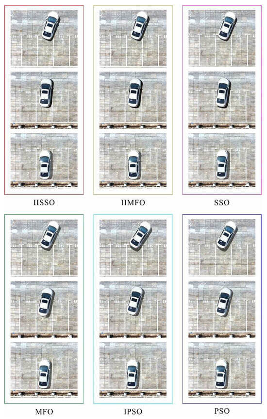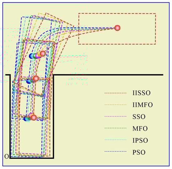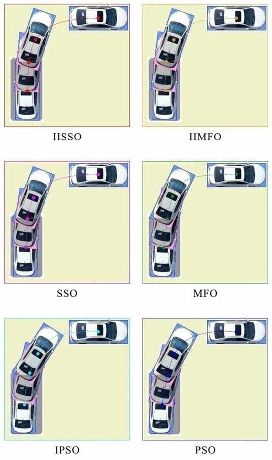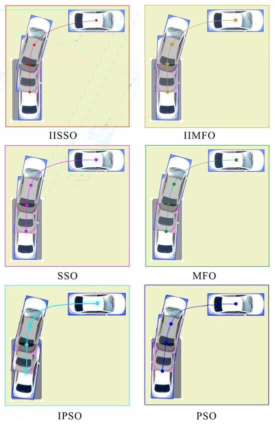 To verify the optimization effect of the proposed parking optimization algorithm, with clear weather and no wind, the proposed IISSO, an IIMFO proposed in [15], the traditional shark smell optimization [18], the traditional moth flame optimization [22], an improved PSO proposed in [16], and the traditional PSO [23] were used to optimize the parking reference trajectory. Fuzzy proportional–integral–derivative (Fuzzy PID) control was selected as the reference trajectory tracking control mode of the above algorithms. To ensure a reasonable comparison of the performance differences, the optimization models of the optimization reference trajectory of the different algorithms were configured with the same parameters, as detailed in Table 1.