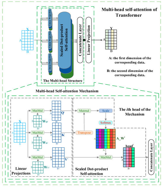 where, in the th head, , , , , , , and represent the query matrix, key matrix, value matrix, transpose operation, scaling factor, attention weights, and corresponding weighted data, respectively. , , , and denote linear projections that are trainable parameters. The multi-head self-attention is shown in Figure 1.