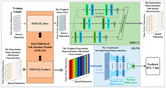 - Differences in importance among sensor data and representations. Each sensor point and each extracted representation contributes differently to RUL prediction. In other words, there are differences in their importance to prediction accuracy. Considering only the differences in importance within sensor data or representations under multiple operating conditions and failure modes can lead to the prediction model failing to enhance a portion of important data and representations, which may reduce the accuracy of the model’s RUL prediction.