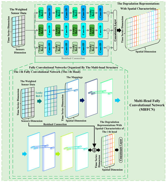 Within a piece of equipment, the degradation of one component not only causes the degradation of other components but also is affected by the degradation of other components. This degradation correlation among components implies that spatial characteristics are embedded in the corresponding sensor data. Therefore, MHFCN is constructed by integrating a fully convolutional network with a multi-head structure to take into account relevant spatial characteristics. As shown in Figure 3, MHFCN utilizes multiple fully convolutional networks to perform convolutional operations on the input in both the sensor and spatial dimensions, extracting the degradation representations with spatial characteristics from the sensor weighted data. Simultaneously, by organizing these fully convolutional networks in parallel through the multi-head structure, MHFCN can effectively enrich the representations it extracts, providing support for subsequent RUL prediction.
