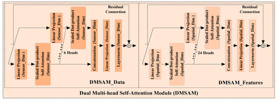 Importance differences in degradation information exist in both the sensor data and representations extracted by the deep neural network. However, some existing models for the RUL prediction of turbofan engines only consider the differences within the sensor data or within the extracted representations, which may result in the loss of some degradation information that can contribute significantly to the corresponding RUL prediction. To alleviate this challenge, DMSAM is built based on Transformer’s multi-head self-attention module. It aims to enhance the key parts of the data and representations that significantly contribute to RUL prediction by learning and allocating relevant attention weights, thus providing support for MSA-FCN’s RUL prediction. As shown in Figure 4, DMSAM consists of two modules, DMSAM_Data and DMSAM_Features, which process various sensor data points and representations extracted by MHFCN, respectively. Specifically, DMSAM_Data and DMSAM_Features process the input data and representations along the sensor and spatial dimensions, respectively, to learn the relationships between different data points and representations, dynamically compute relevant attention weights, and allocate those weights to the corresponding parts within them. Through the above processes, DMSAM_Data and DMSAM_Features can effectively generate weighted sensor data and weighted degradation representations with spatial characteristics, respectively. They share the same network structure, but the former uses more heads than the latter to adapt to the increased number of representations after MHFCN processing. The residual connection of both modules is performed after layer normalization, which is different from the residual connection in Transformer. This can be expressed as .