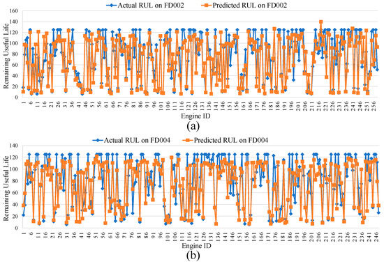 Except for the Score average on FD002, the remaining averages achieved by MSA-FCN are the lowest among all comparison models. This result suggests that DMSAM_Data, MHFCN, and DMSAM_Features, constructed using the multi-head structure, enable MSA-FCN to enrich the extracted representations, leading to more timely RUL predictions. Finally, the STD values obtained by MSA-FCN are the lowest among all the comparison models, indicating that the multi-head structure enhances the stability of its RUL prediction results.