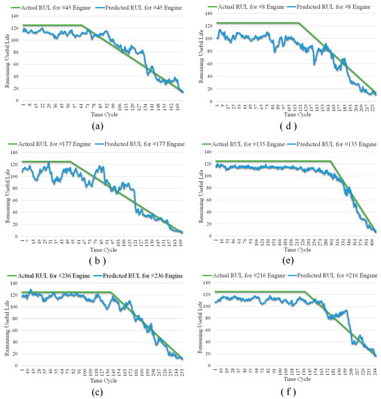 RUL prediction results for different tested engines. (a) Test engine #45 from FD002; (b) test engine #177 from FD002; (c) test engine #236 from FD002; (d) test engine #8 from FD004; (e) test engine #135 from FD004; and (f) test engine #216 from FD004.