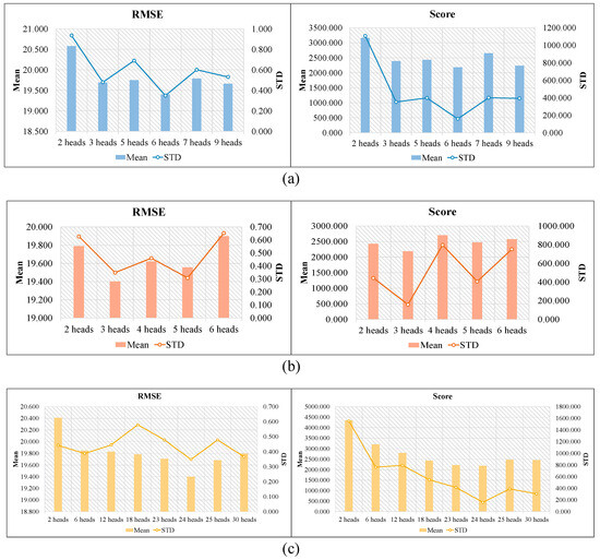 Effects of the multi-head structure’s number of heads on RUL prediction: (a) DMSAM_Data; (b) MHFCN; and (c) DMSAM_Features.