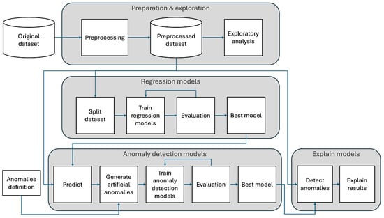 Figure 1, where a public dataset containing energy consumption data was prepared and explored to understand its behavior as a time series. Then, various regression models to predict energy consumption were trained and evaluated. The best regression model was selected to provide accurate energy consumption predictions and generate artificial anomalies to train and evaluate three different anomaly-detection models as well. Once the best anomaly-detection model was obtained, a scenario to detect unknown anomalies and explain them was studied.