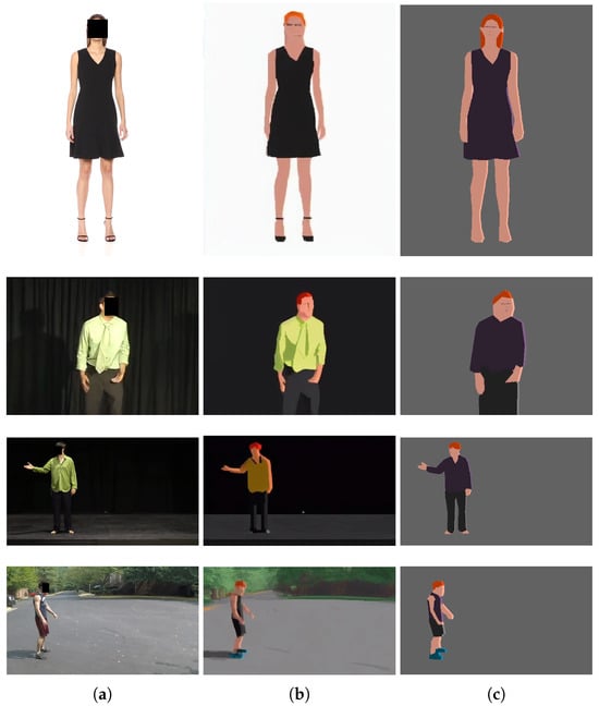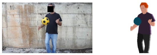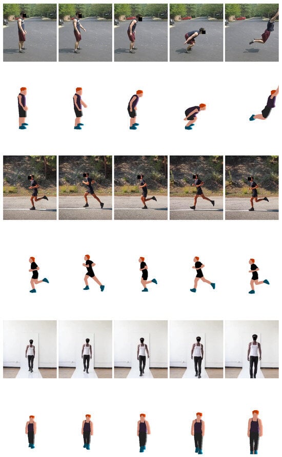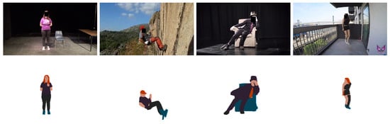 In order to evaluate the performance of the method, we collected a set of 25 short videos ranging from 5 to 20 s in duration. The videos showcase a lone human subject displaying various clothing styles and engaging in diverse actions. The videos were obtained from the UCF101 Human Actions dataset [], the Fashion Video Dataset [], the Kinetics dataset [] and YouTube. The assembled dataset includes both low- and high-resolution videos and both in-the-wild and controlled-setting videos. The dataset and the results of the experiments can be found in []. Figure 7 and Figure 8 show some of example results.