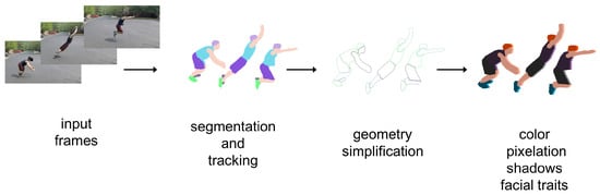 The method approaches the challenge mainly as an object segmentation problem. Given a frame depicting a person, a mask for each different visual trait (hair, skin, clothes, etc.) is generated with the Segment Anything Model (SAM) []. To univocally identify the masks in all the frames, a video object tracking algorithm is employed using the approach of []. The masks are purged to solve segmentation errors and their geometry is simplified with the Douglas–Peucker algorithm [] to achieve the desired visual style. Finally, facial traits, pixelation and a basic rim light effect can be optionally added.