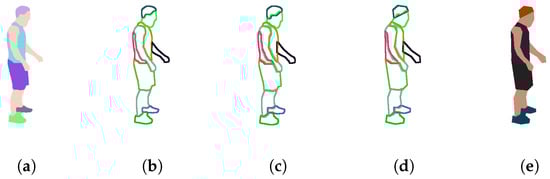 Graphical overview of the contour simplification stage of one frame: (a) result of the segmentation and tracking step; (b) contours detection; (c) contours dilation; (d) contours simplification; (e) resulting colored frame.