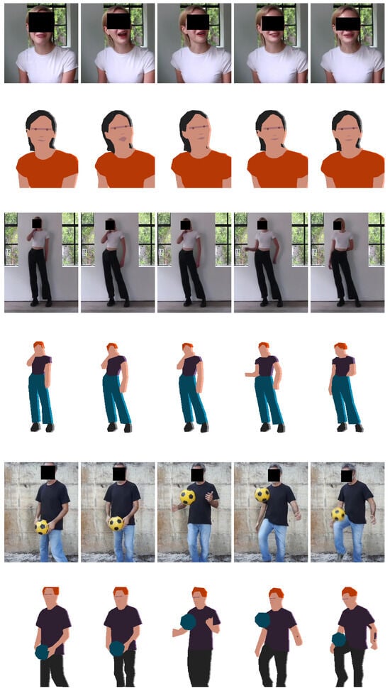 The main input to the method (the code is available at https://github.com/rtous/lester-code (accessed on 20 July 2024); the dataset and the results of the experiments are publicly available at https://github.com/rtous/lester (accessed on 20 July 2024)) is a target video sequence T of a human performance. There are not general constraints about the traits of the depicted person (gender, age, clothes, etc.), pose, orientation, camera movements, background, lighting, occlusions, truncations (partial body shots) or resolution. However, certain scenarios are known to potentially impact the results negatively (this will be addressed in Section 4). While the method is primarily designed for videos featuring a single person, its theoretical application with multiple individuals will be discussed in Section 4. When operating without additional inputs, the method defaults to specific settings for segmentation, colors and other attributes. However, it is anticipated that the user might prefer specifying custom configurations, necessitating supplementary inputs such as segmentation prompts, color palettes, etc., as detailed in corresponding subsections below. The output of the method is a set of PNG images showing the resulting animated character and no background (where the alpha channel is set to zero).