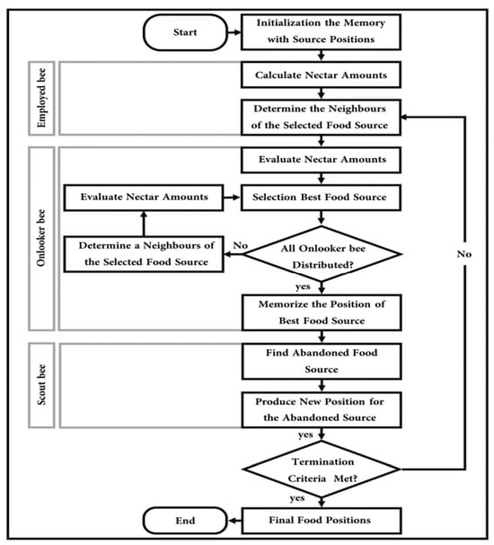 In the current study, we employed the Artificial Bee Colony (ABC) algorithm that was first proposed by Karaboga []. It mimics the collaborative and collective foraging behaviour of a bee colony. In the ABC algorithm, there are three different types of bees: scout bees, employed bees, and onlooker bees. Each type has a different role in the exploration and exploitation of food sources. A food source represents the solution to a problem, and better solutions belong to food sources with more nectar. The ABC algorithm works as follows: Initially, the scout bees are assigned randomly to the search space to find initial food sources. Then, the employed bees are sent out to exploit the places discovered by scout bees, with each employed bee assigned to one food source. After that, the employed bees start a neighbourhood search to find a better food source nearby. After finding a better food source, the employed bees leave all previous food sources and exploit only the better ones. These employed bees then return to the hive and share their information about discovered food sources with onlooker bees through what is called the waggle dance. The decision of whether the onlooker bees will follow the employed bees depends on the richness of the food sources. If the onlooker bees do decide to follow, they then become employed bees and repeat the procedure of the employed bees. After several iterations, the food source might be exhausted; at that point, the employed bees become scout bees and start searching randomly to find a new food source to replace the previous one. The flowchart of the ABC algorithm is illustrated in Figure 1 [].
