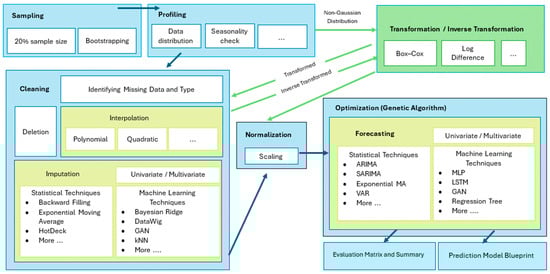 The quest for the most accurate forecasting model with minimal error rates in numerical time series analysis requires exhaustive experimentation with various techniques and their combinations. The type of technique applicable to a particular type of data should also be known []. However, this process is time-consuming and labor-intensive. Different imputation methods are employed based on the time series properties, such as distribution and seasonality, to handle missing values effectively. With the exponential growth of time series data generated by diverse sources like stock exchanges [], energy consumption [], health monitoring systems, and weather recording systems, analysts face increasing workloads. Time series, characterized by sequential data recorded over time intervals, present unique challenges such as handling noise, seasonality, and missing values, which necessitate specialized preprocessing techniques to ensure data quality and improve forecasting accuracy.