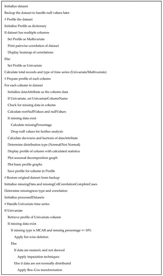 According to [], time series analysis is mostly performed using statistical methods; however, machine learning techniques have increasingly gained prominence in time series analysis, promising more accurate results with adequate preprocessing. However, preprocessing remains vital for enhancing data quality and ensuring reliable predictions []. Techniques like SCREEN [] offer constraint-based cleaning methods for time series data, improving accuracy and efficiency in data analysis. Research studies have explored various approaches to enhance preprocessing techniques for time series data. One study [] utilized meta-learning to select preprocessing alternatives, focusing on transformation effects on algorithm performance across datasets such as Automobile, Credit, Iris, and Vote. While regression trees showed limited effectiveness as a meta-learner, transformations significantly improved outcomes. Another study [] introduced an iterative minimum repairing and parameter prediction method for anomaly repair, achieving a substantial enhancement in execution speed across datasets including GPS, Intel Lab Data, and China Meteorological data. In a separate investigation [], Landsat time series imagery combined with trajectory analysis was employed to detect forest instabilities in Myanmar. This study highlighted the correlation between areas of instabilities and harvested trees, indicating potential applications for selective logging. Change detection in time series was comprehensively analyzed [], covering preprocessing techniques like atmospheric correction and cloud detection, along with popular automated preprocessing algorithms like LEDAPS and Fmask. Augmenting fully convolutional networks with LSTM-RNN was proposed [] for time series classification, demonstrating improved performance with attention mechanisms. Additionally, studies [] addressed data profiling issues, proposing visual-based software solutions for data quality checks and outlier detection techniques using methods like the k-sliding window technique and neural networks [].