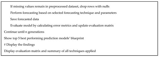 Time series values to be forecasted can be nominal, categorical, textual, and numerical. Numerical forecasting is a regression problem which can be solved using various techniques like moving averages, autoregression, and exponential smoothing, as well as advanced methods like ARIMA, SARIMA, VAR, and LSTM []. Hybrid approaches combining statistical and machine learning models are also common [,,]. However, no single technique suits all time series due to their varying properties, making the selection process time-consuming and complex. To streamline the process of analyzing a time series, a standard procedure should be adopted to automate profiling, preprocessing, optimized model forecasting, evaluation, and selection of the best-performing model with minimal error.