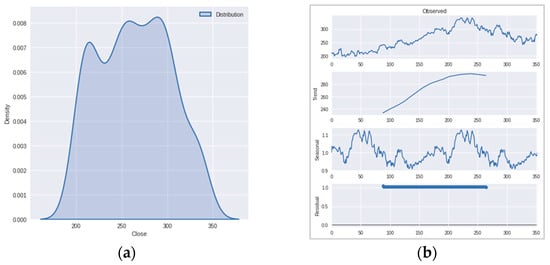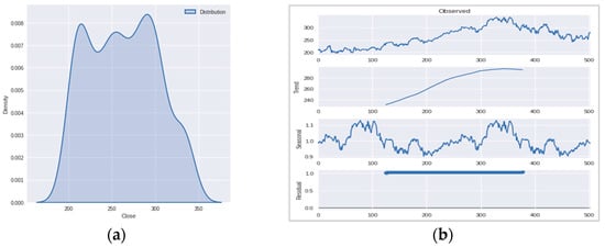 (a) Decomposition graph of closing price to split the trend and seasonality component. The graph shows a slight upward trend and no seasonality. (b) The graph shows normal data distribution of closing price data.