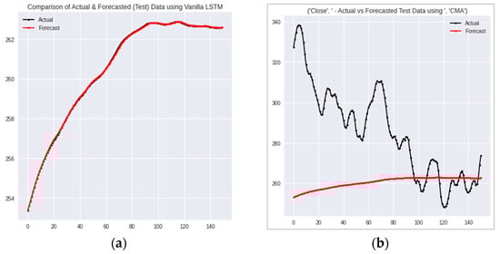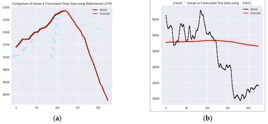 (a) Comparison of actual and forecasted data generated by Bidirectional LSTM imputed by GAIN. (b) Comparison of actual and forecasted series generated by CMA imputed by spline of 5th-degree polynomial.