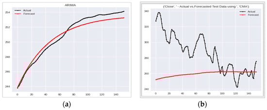 The experiment involved trying multiple preprocessing techniques and models, including interpolation, forward and backward filling, moving averages, and deep learning techniques like GAN for imputation. Each model underwent evaluation on the test dataset using various metrics. The results indicated that ARIMA (p, d, q) with order (7, 1, 2) performed best when missing data were imputed using CMA. The Ljung–Box test confirmed the absence of autocorrelation in the white noise and model. This ARIMA model yielded an MAE of 0.56997 and RMSE of 0.6099. The top five models predominantly belonged to ARIMA, utilizing different imputation techniques such as spline order 3, polynomial order 5, backward filling, and padding. After ARIMA, the exponential moving average performed well with multiple imputation techniques including linear, slinear, piecewise polynomial, and derivative techniques. The first 85 models, which performed well, were all statistical models. Conversely, the CMA-based model processed by a polynomial with degree 9 performed the worst, with an MAE of 28.4643 and RMSE of 36.5159. Figure 6 illustrates the performance of the best and worst models in the experiment, with Figure 6a displaying the values predicted by the ARIMA (7,1,2) model on the dataset imputed by CMA compared with the original values of the test set, while Figure 6b showcases the performance of the CMA model. Support vector regression with a polynomial kernel model imputed using time interpolation emerged as the best in the machine learning category, yielding an MAE of 3.6430 and RMSE of 4.7306. The errors computed for the mentioned models are tabulated in Table 2.