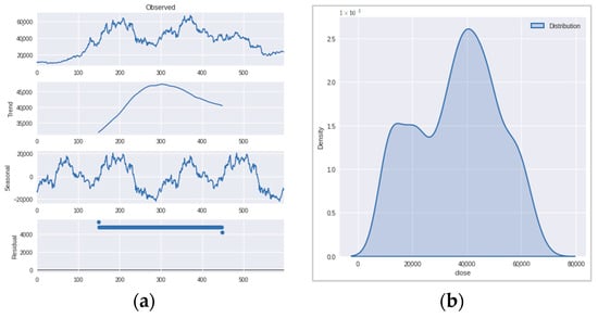 (a) Decomposition graph of closing prices of Bitcoin (b) Data distribution: the graph shows normal data distribution of Bitcoin’s closing price in USD.