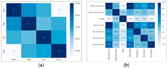 (a) Correlation heatmap showing correlation between pairs in stock market multivariate dataset. (b) Correlation heatmap showing correlation between pairs in power consumption multivariate dataset.