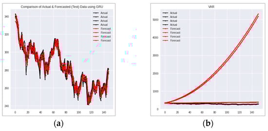 (a) GRU performance comparison for multivariate time series data during testing. (b) VAR model performance comparison for multivariate time series data during testing.