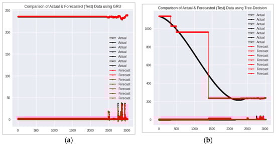 (a) GRU imputed with exponential moving average: performance comparison for power consumption series data during testing. (b) Decision tree imputed with polynomial interpolation of degree 3: performance comparison for power consumption series during testing.