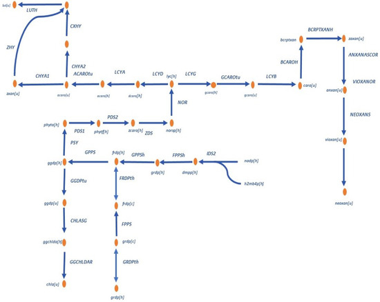 In this case, a part of the pigment distribution network will be studied since the distribution in microalgae such as C. vulgaris is of great importance in the study of pigment synthesis. The reactions involved in the metabolism are presented in Appendix A.1, Table A1. This network includes the complexity of reversible and irreversible (FRDPth, GRDPth) reactions, nodes, and cycles, and are showed in the Figure 1.