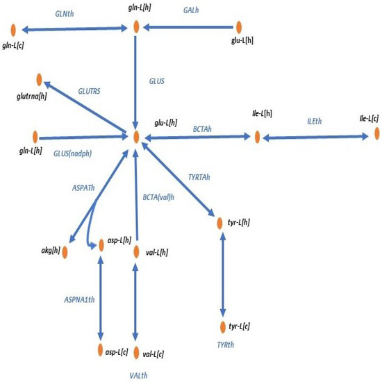 This metabolic network represents great complexity due to the number of metabolites that branch at the central node and the presence of reversible reactions such as ASPATh and ASPNA1Th. This network was evaluated in three different growth conditions, autotrophy, heterotrophy, and mixotrophy, using the NSGAII and MOEA/D algorithms with their four MOFBAs. This metabolism is of great importance because the pathways for producing different products of interest, amino acids such as tyrosine, valine, leucine, etc., are involved, which can later be used to produce proteins. The reactions involved in the metabolism are presented in Appendix A.1, Table A2. Figure 2 represents the distribution of fluxes associated with glutamate metabolism in the chloroplast and cytoplasm.