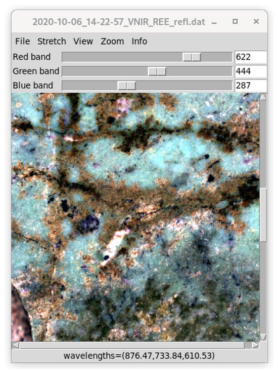 The image viewer of HypPy offers a no-frills display for viewing hyperspectral images and retrieving spectra. The image viewer was designed for a quick interactive assessment of image quality and the retrieval of endmember spectra. Its simplicity makes it easy to use for novice users of hyperspectral data. Sliders can be used to change the display from one band to another. In color mode, three sliders are available, one for each of the RGB channels of the display. A status bar at the bottom of the window presents information on wavelengths of bands, cursor position, and more. Using the sliders and the left mouse button, the bands and the spectra of the input image can be assessed on quality and information content. Figure 2 shows the hyperspectral image of a rock sample. This particular rock sample 15-91-FE is part of the Fen Complex in Norway, which comprises a carbonatite intrusion [].