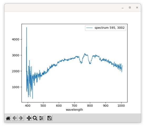 Plot window showing the spectrum of pixel location 595, 3002. The spectrum shows two absorption features at 740 and 800 nm. These features are due to rare earth elements (in particular neodymium) contained by monazite crystals. The spectrum below 450 nm is noisy due to the low sensitivity in the blue of the hyperspectral VNIR camera. The toolbar at the bottom of the window is a standard matplotlib figure toolbar and has buttons for navigating the figure: home, back, forward, pan/zoom, zoom-to-rectangle, and subplot configuration. The save button on the right can be used to save the figure to various formats such as png or pdf.