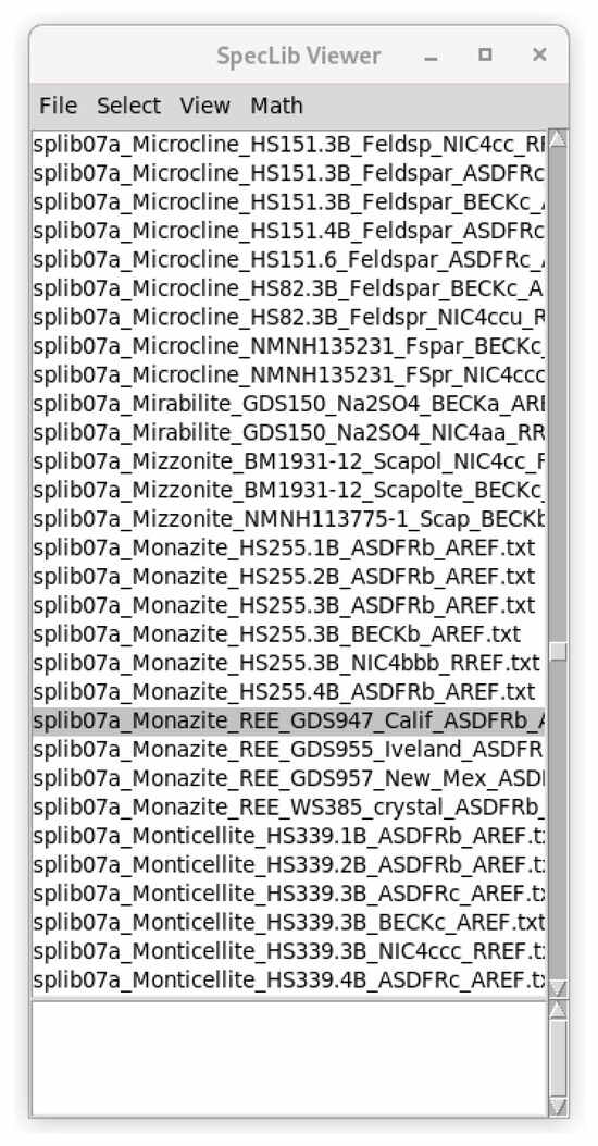 HypPy supports two basic types of spectral libraries: ENVI spectral libraries and ASCII or text-based spectral libraries. In ENVI spectral libraries, a major drawback is that the list of wavelengths has to be the same for all the spectra in the spectral library. Therefore, the number of bands and the central wavelengths of all the spectra must be the same for all included spectra. An advantage of this format is that it is a binary format and can be addressed like an image, which offers the possibility to process spectral libraries in the same manner as spectral images. This can be used to test processing chains on spectral libraries before running them on images. A process for detecting certain minerals can be tested on the USGS spectral library [], for instance, before applying it to an image. Problems with false positives of certain minerals can be caught in the early stages of developing a processing chain.